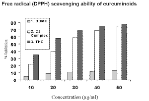 In the DPPH radical scavenging method, the ability of an antioxidant to bind the 1.1 diphenyl-2-picrylhydrazyl -radical (a very stable free radical species) is measured, using various concentrations of the selected antioxidants. A compound with high antioxidant potential effectively traps this radical thereby preventing its propogation and the resultant chain reaction. Figure 3 compares the free radical scavenging ability of curcuminoids.